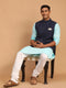 This stylish navy blue Nehru jacket pairs perfectly with the aqua blue kurta and white pyjama set, creating a sophisticated and trendy ensemble.