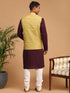 Vastramay Men's Yellow Jacquard Nehru Jacket with Kurta Pyjama Set