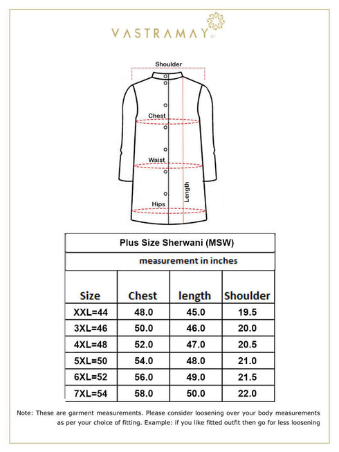 Make a bold style statement with this black sherwani top for men from VASTRAMAY. Crafted to perfection, this plus-size sherwani is perfect for weddings, festive occasions, and special events. Its elegant design and comfortable fit make it a must-have in every man's ethnic wardrobe.